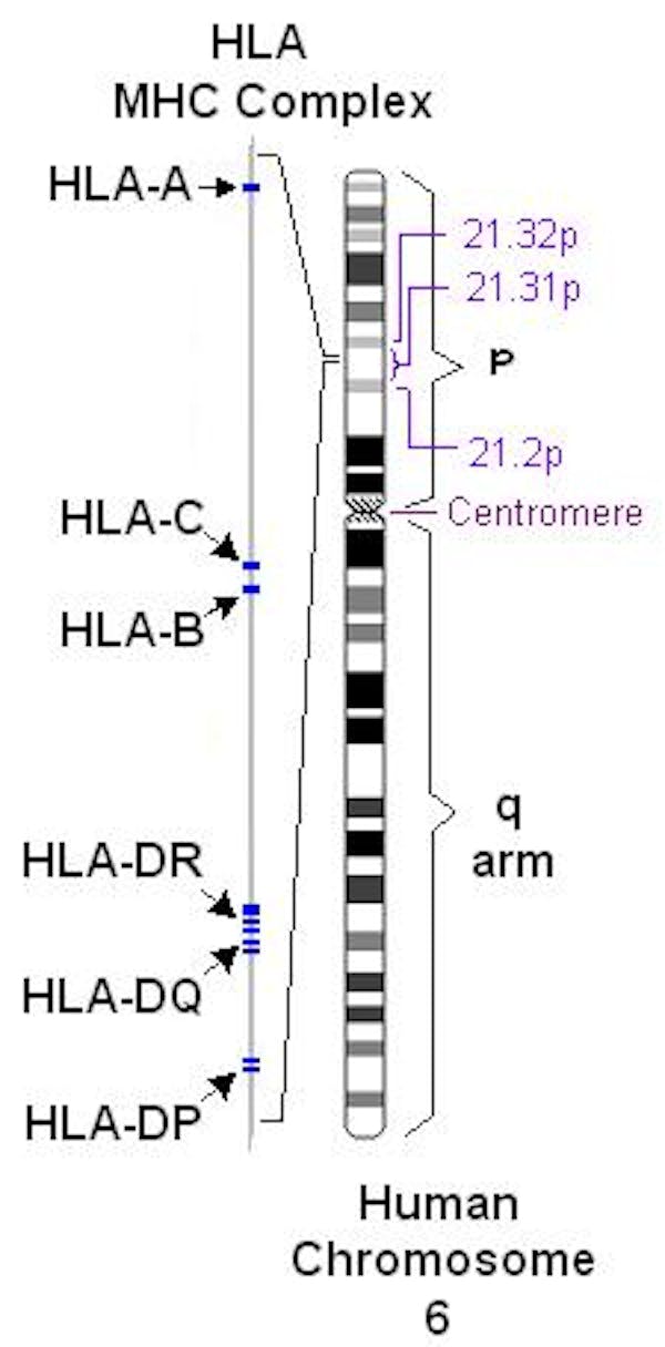 The section of DNA that codes for HLAs is on the sixth chromosome.  Pdeitiker at English Wikipedia / Wikipedia, CC BY