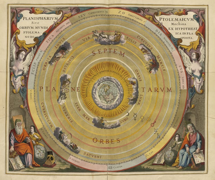 Ptolemy’s Earth-centered universe with the moon, Mercury, Venus, the sun, Mars, Jupiter and Saturn orbiting our planet. Andreas Cellarius, CC BY