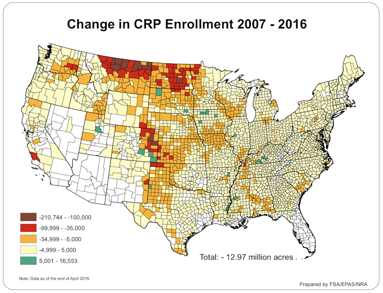 But this is a voluntary program, so enrollment ebbs and flows in tandem with crop prices. For example, when corn, soy and wheat prices fell in the late 1980s and early 1990s, enrollment grew. Then with the commodity price boom of 2007, farmers could make more money from cultivating the land. Protected acreage dropped more than 40% through 2019, erasing many of the environmental benefits that had been achieved.