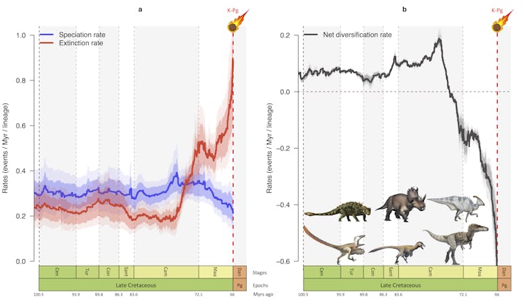 Once each fossil was properly categorized, we used a statistical model to estimate the number of species that evolved over time for each family. We were thus able to trace the species that appeared and disappeared between 160 and 66 million years ago and estimate, again for each family, the rates of speciation – the evolution of new species – and extinction over time.