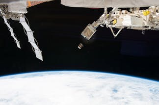 Starlink satellites are released in batches, and 40 were destroyed in early February because of a geomagnetic storm. SpaceX via WikimediaCommons