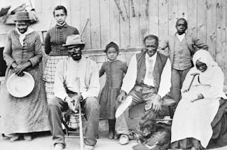 Harriet Tubman, far left, poses with her family, friends and neighbors near her barn in Auburn, N.Y., in the mid- to late 1880s. Bettmann/Getty Images