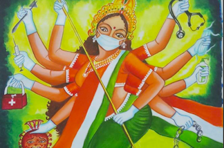 People admire a massive statue of the Hindu goddess Kali. Jerry Redfern/LightRocket via Getty Images–