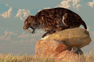 The earliest people who lived in North America shared the landscape with huge animals. On any day these hunter-gatherers might encounter a giant, snarling saber-toothed cat ready to pounce, or a group of elephantlike mammoths stripping tree branches. Maybe a herd of giant bison would stampede past.