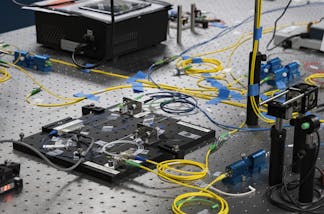 Researchers can use mirror-like beam splitters to put phonons, or quantum sound particles, into a state of superposition. Peter Allen via University of Chicago