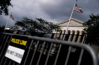 Fulton County Sheriff officers block off a street in front of the Fulton County Courthouse on 2023 Aug 14 in Atlanta, Georgia. Joe Raedle/Getty Images