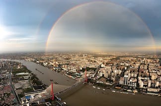 A rainbow represents all the different components that make up sunlight. As that light passes through the water droplets suspended in the air, it is broken up into the component colors called the visible spectrum – red, orange, yellow, green, blue, indigo and violet, more easily remembered as ROY G. BIV.