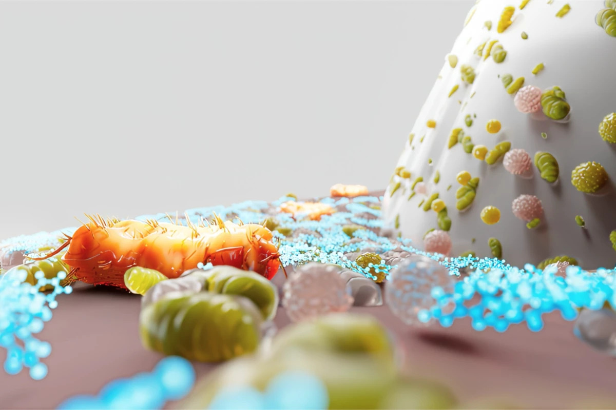 A schematic illustration of Porphyromonas gingivalis bacteria (orange), the active compound in the toothpaste (blue) and a healthy microbiome at the transition between gum and tooth. PerioTrap –
