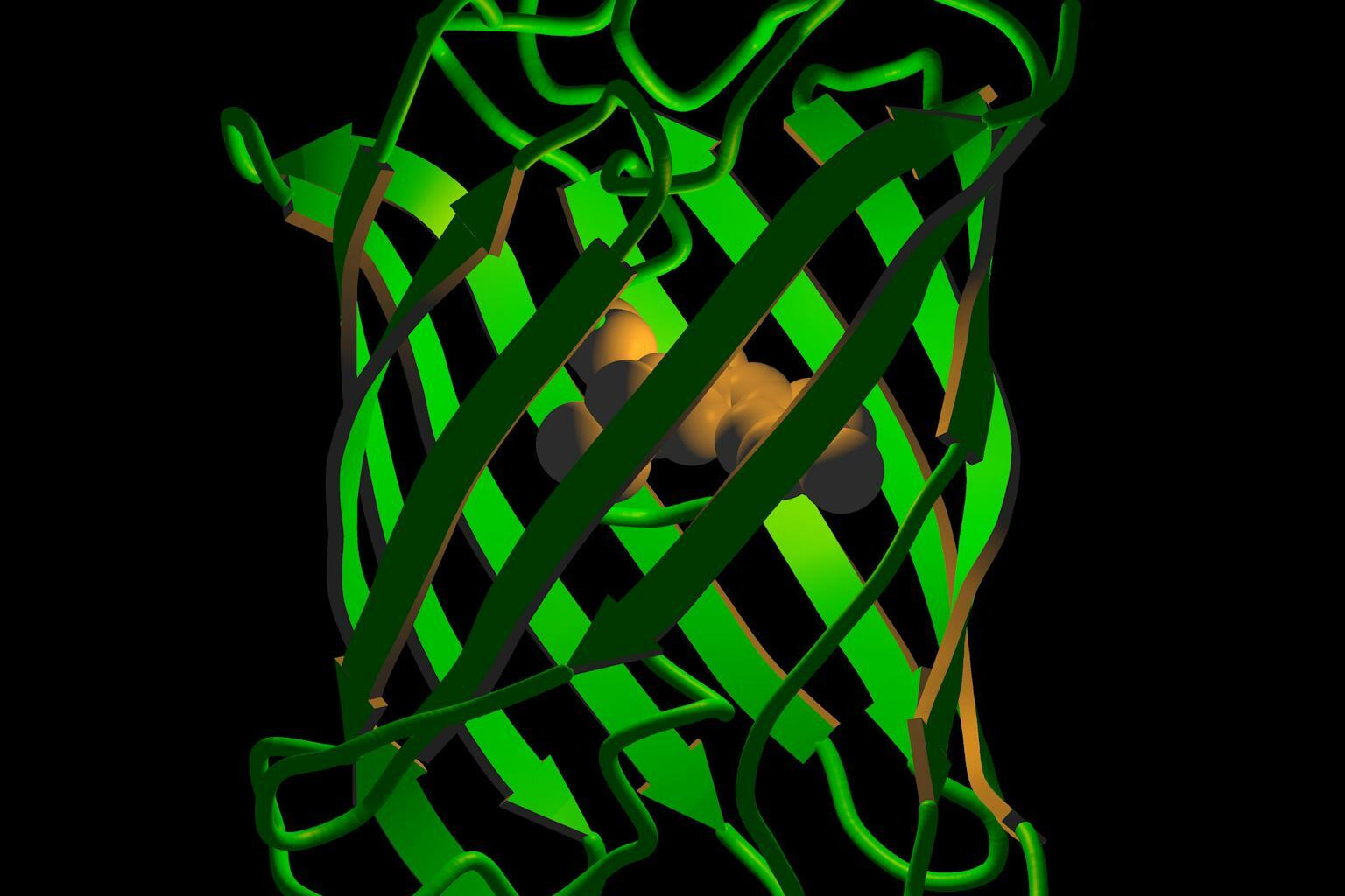 Green fluorescent protein, first isolated from a jellyfish, glows bright green when under a blue light. Biologists fuse green fluorescent protein to other proteins to track where the proteins go and when they are made.