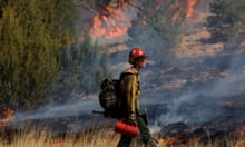 A firefighter spreads mud around a burning tree in Ruidoso, New Mexico, on Tuesday. Photograph: Kaylee Greenlee Beal/Reuters